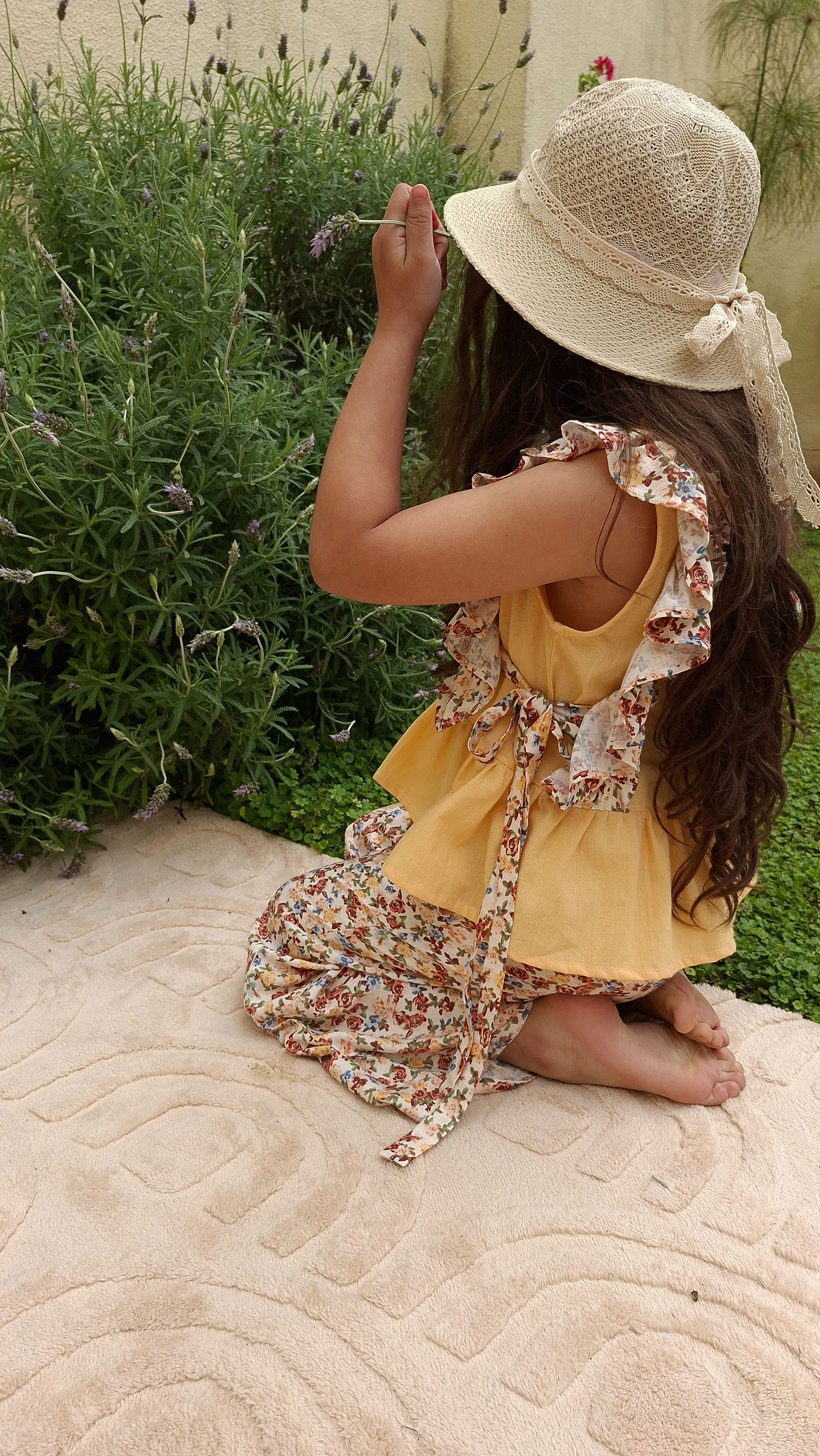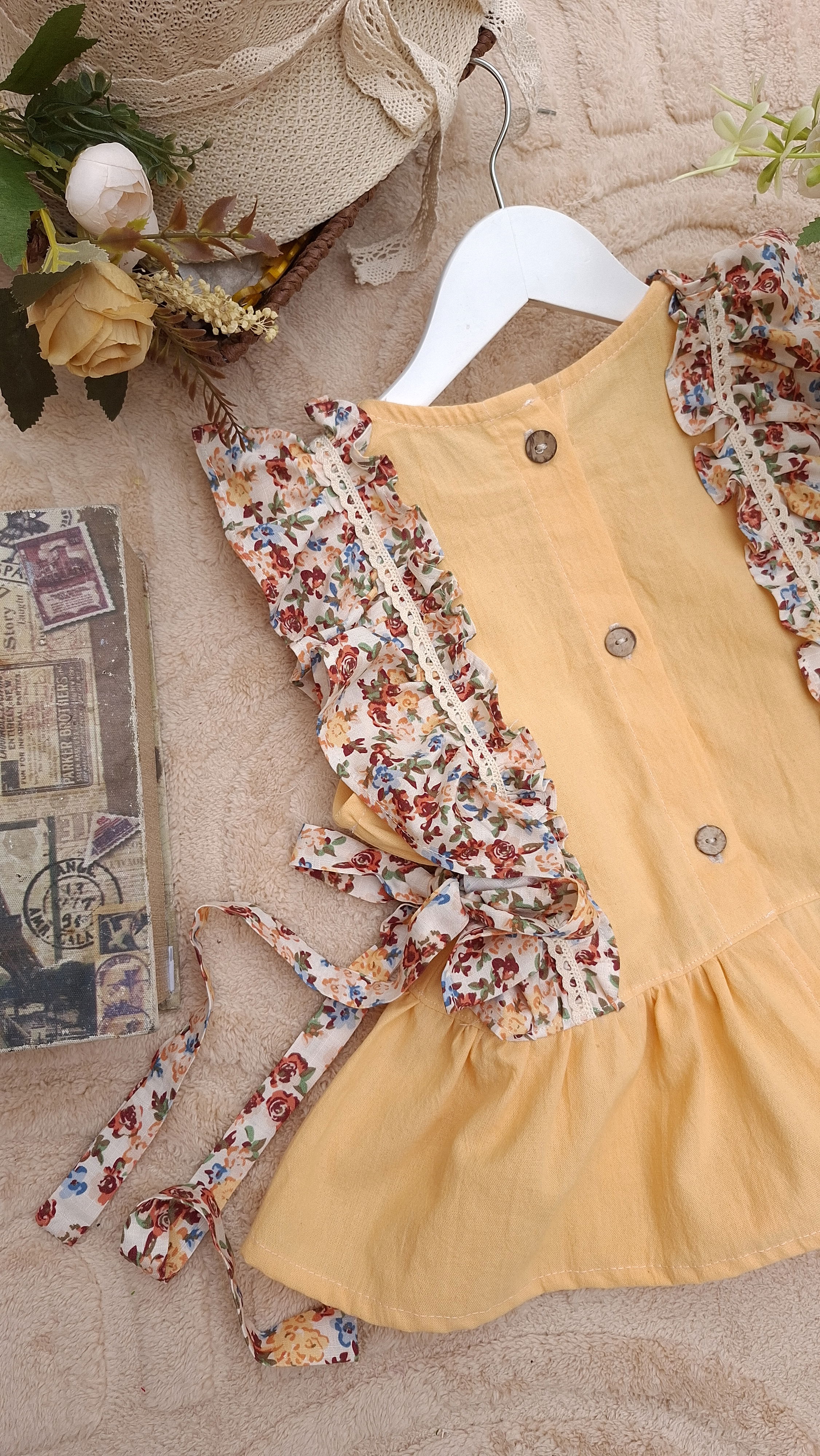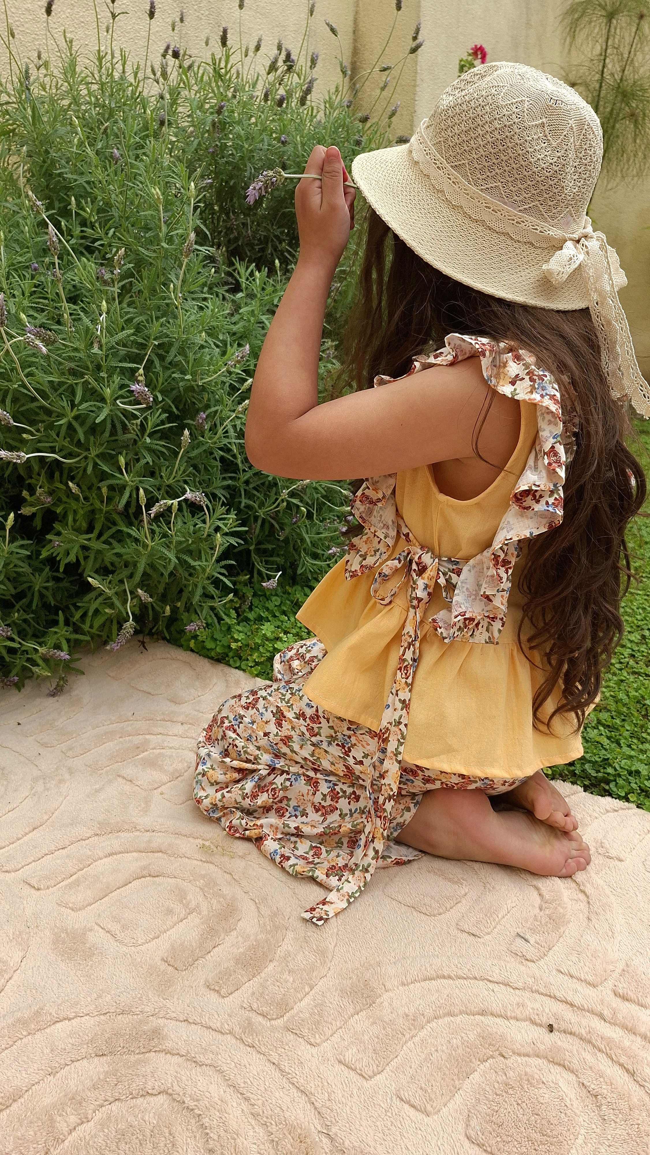 Elaborada en tusor color Mango con detalles de vuelitos de lino. Botones de coco en la espalda y tiras para ajustar en los costados