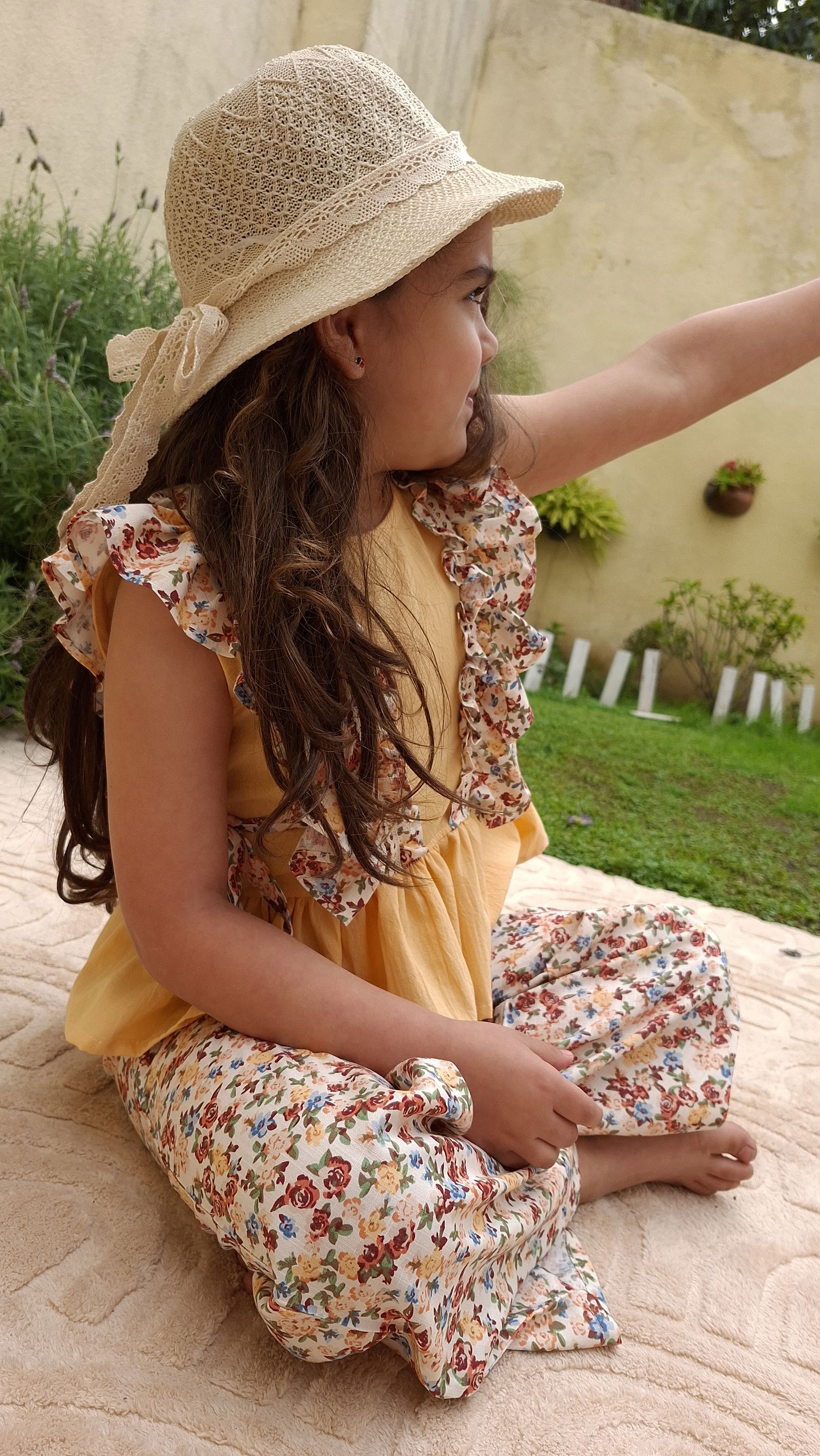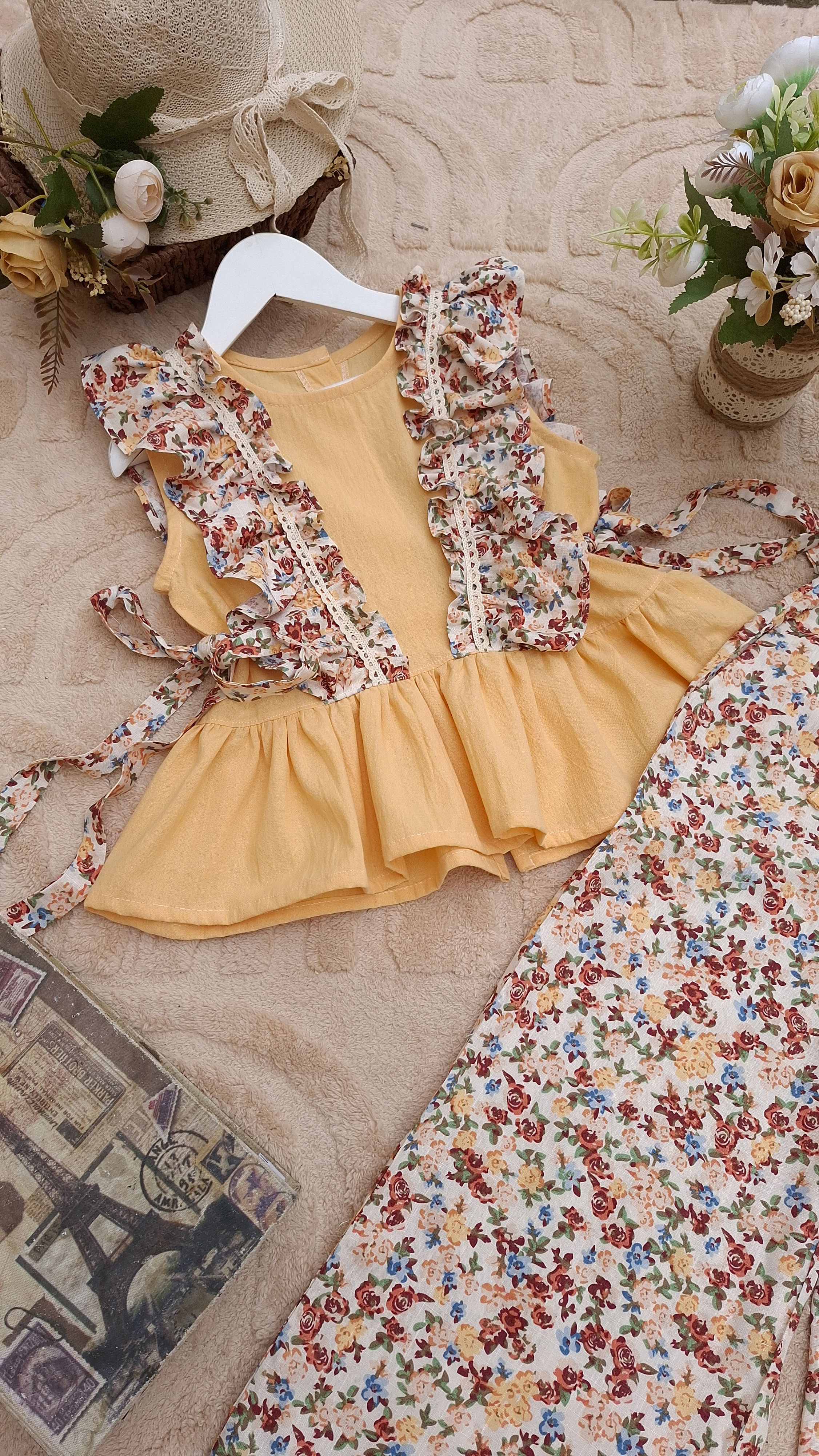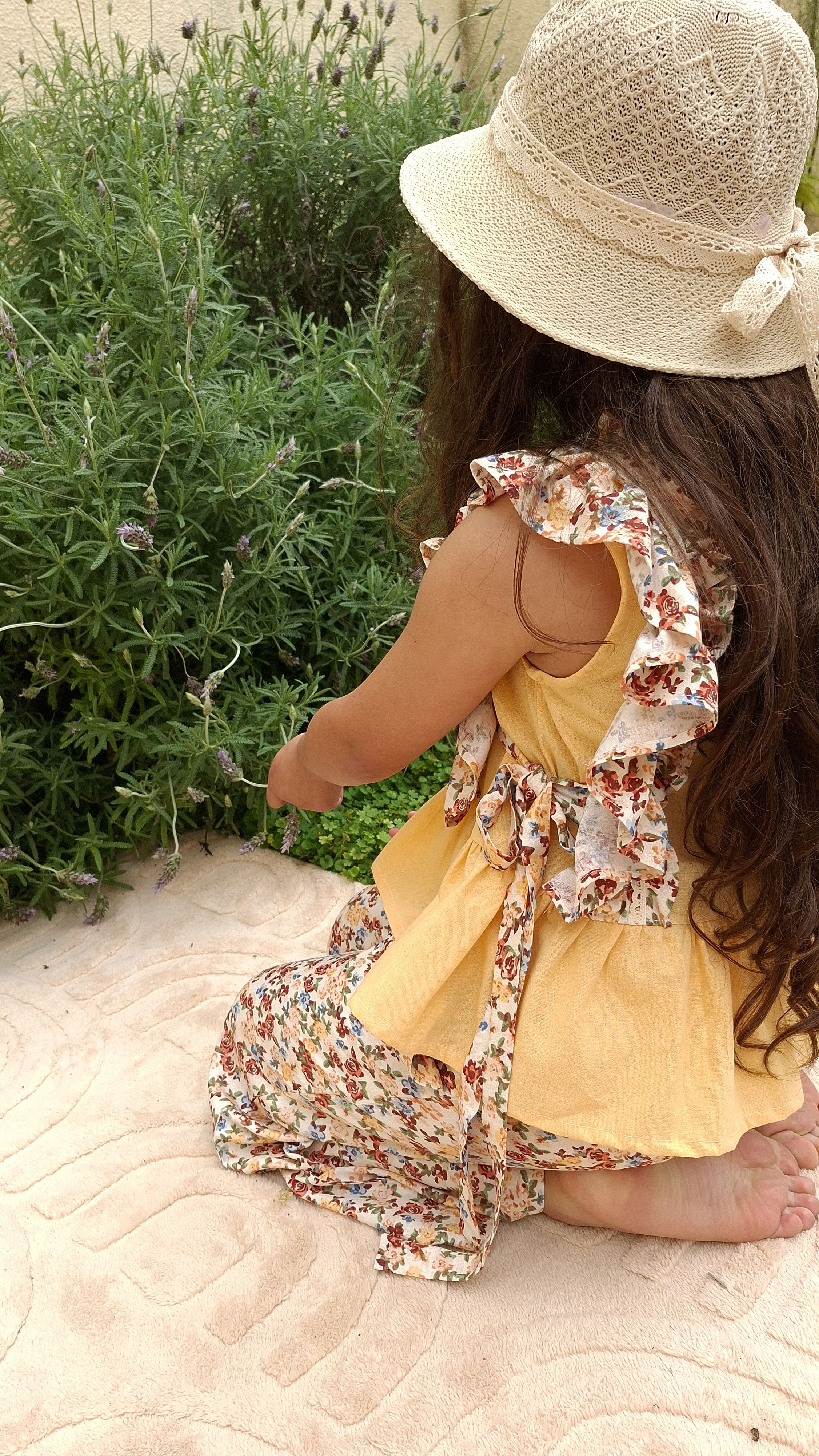 Elaborada en tusor color Mango con detalles de vuelitos de lino. Botones de coco en la espalda y tiras para ajustar en los costados