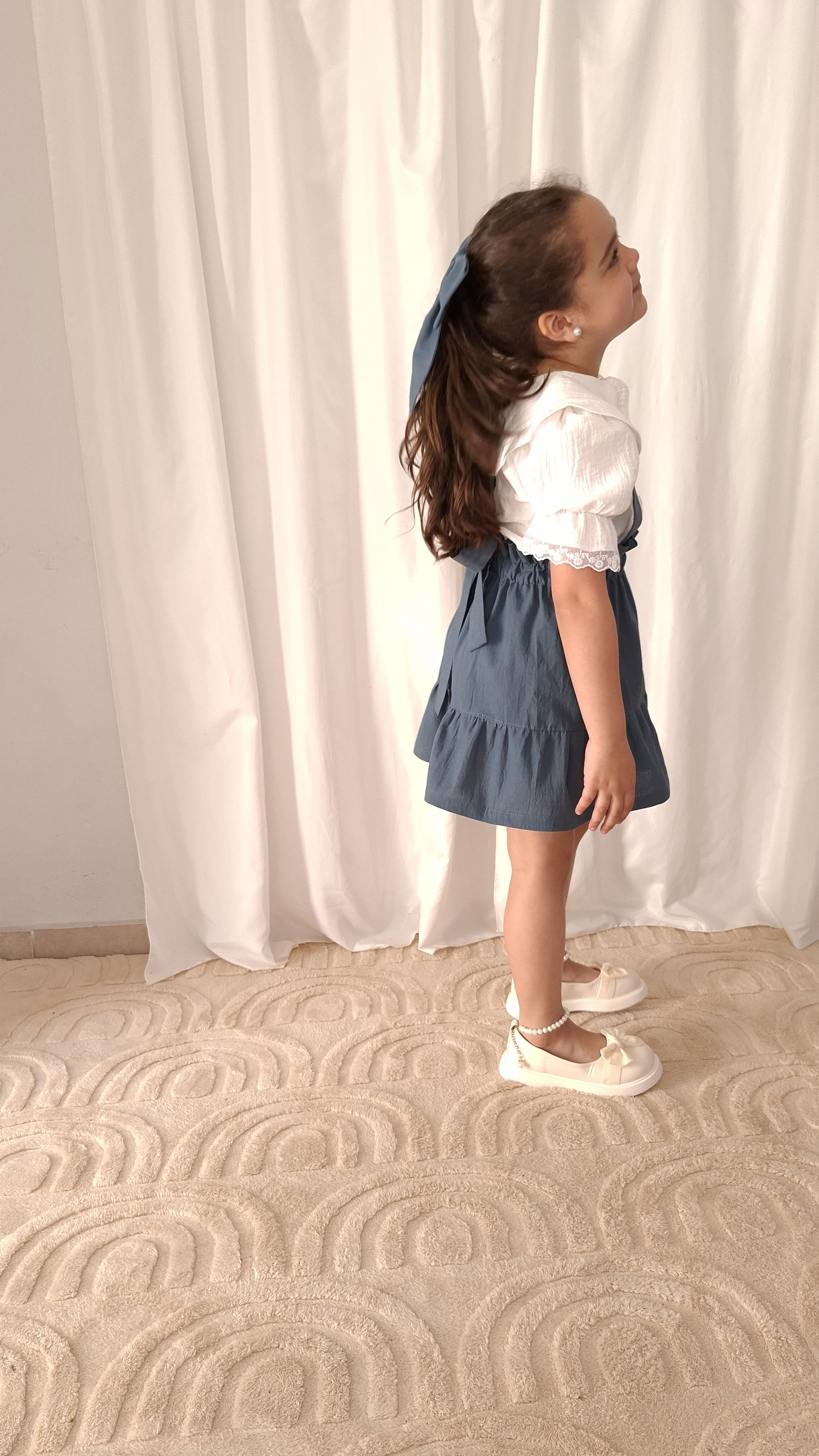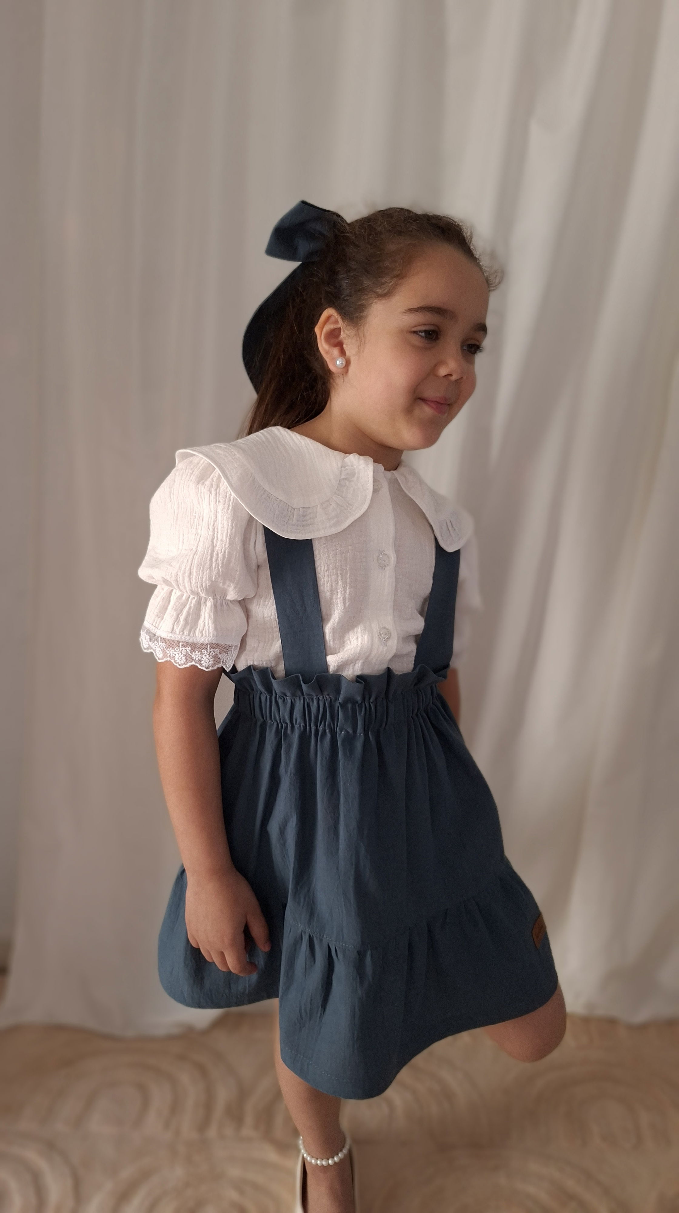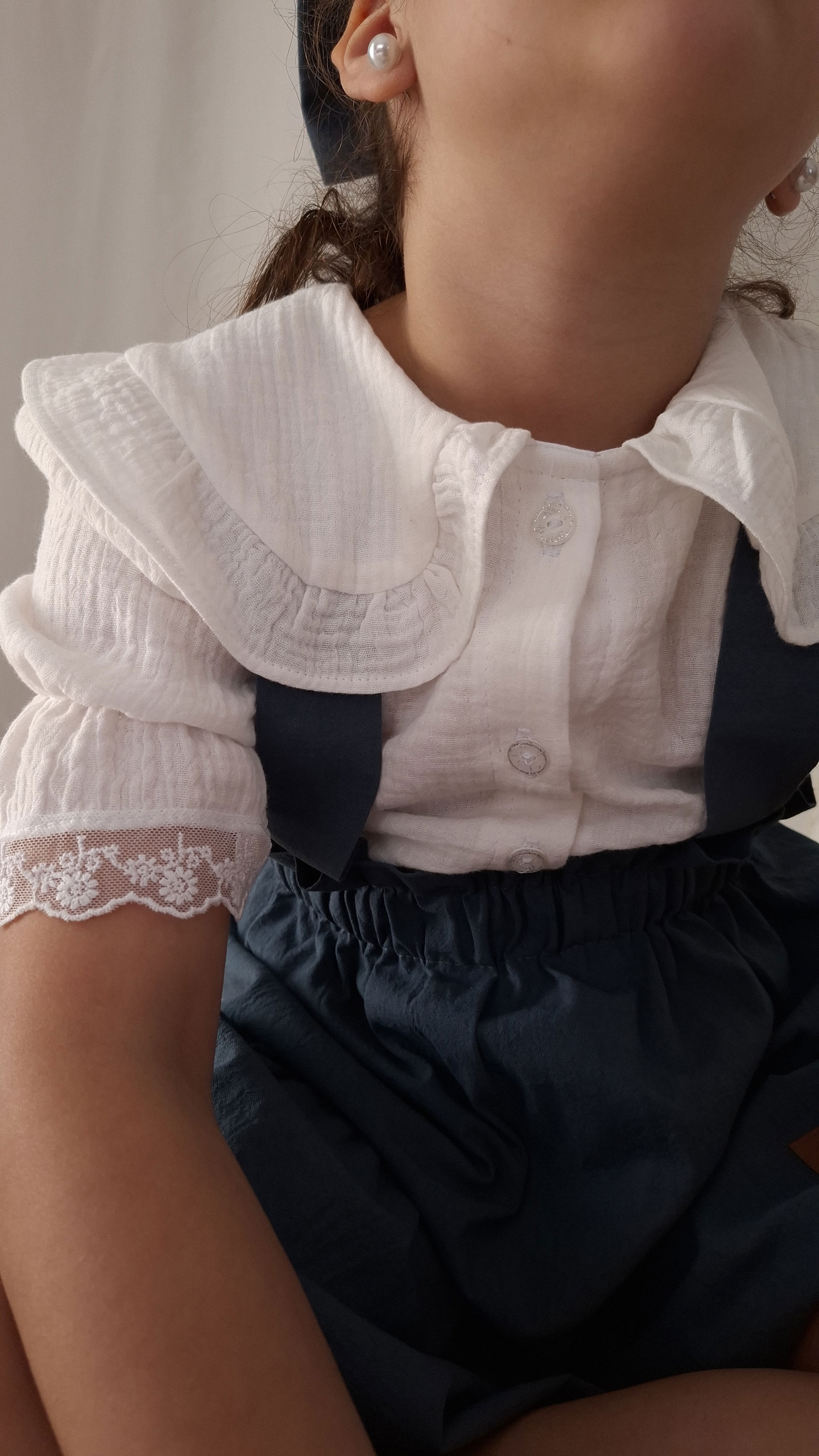 Esta hermosisima camisita está confeccionada en tela baby cotton, con cuello bebe y vuelitos. Manguita bombé con detalles de microtul bordado y botones blancos con brillitos