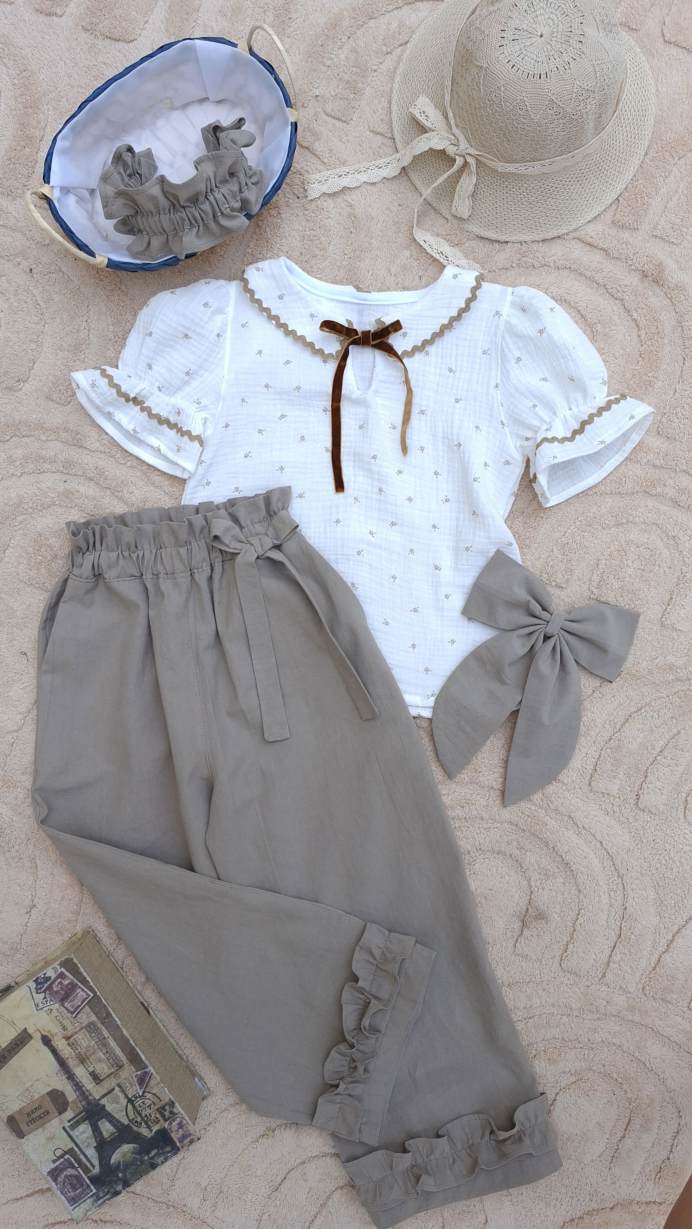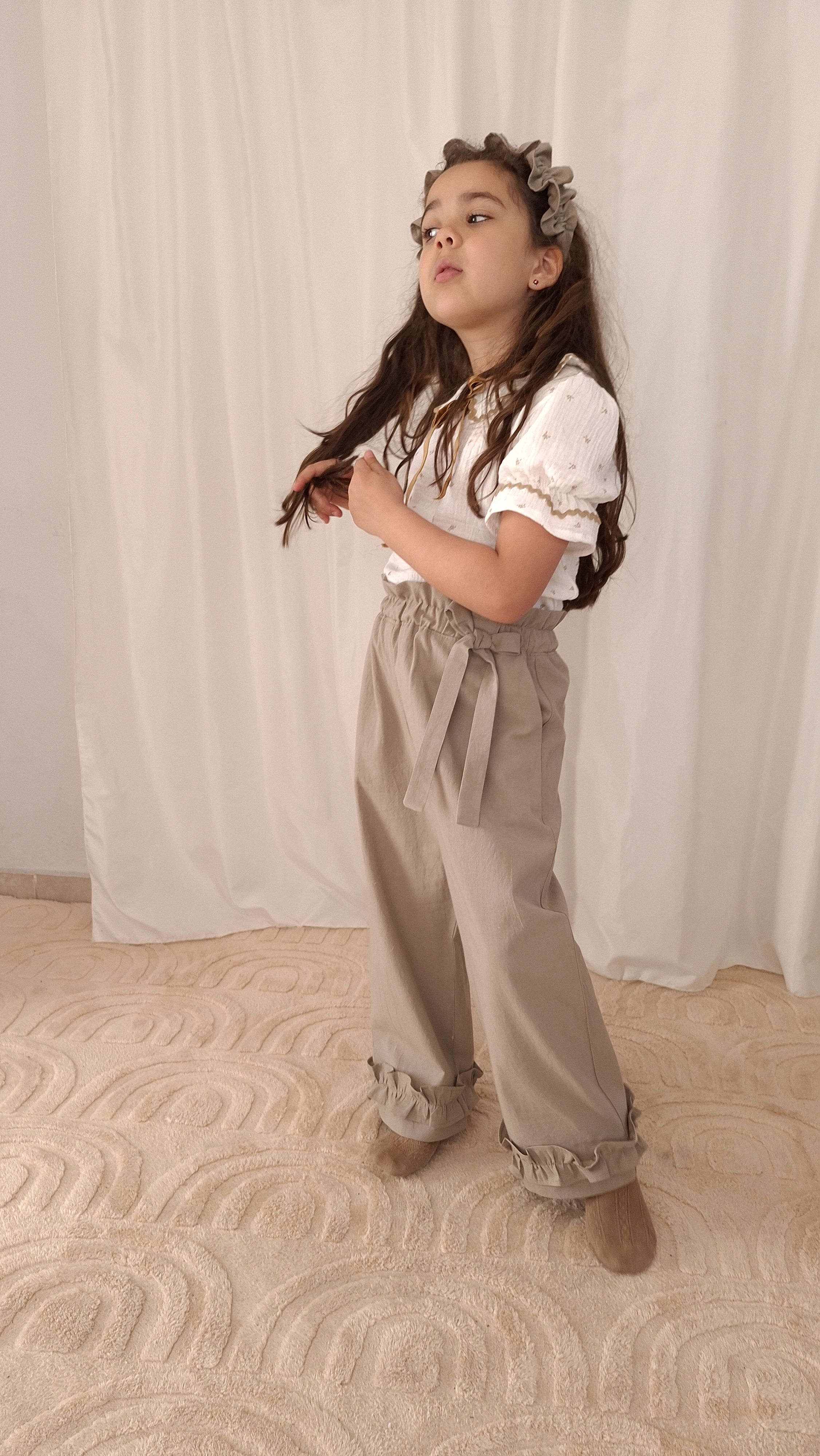 Pantalón ancho con bolsillos laterales y cintura elastizada, detalle de vuelitos en botas manga y lazo en la cintura