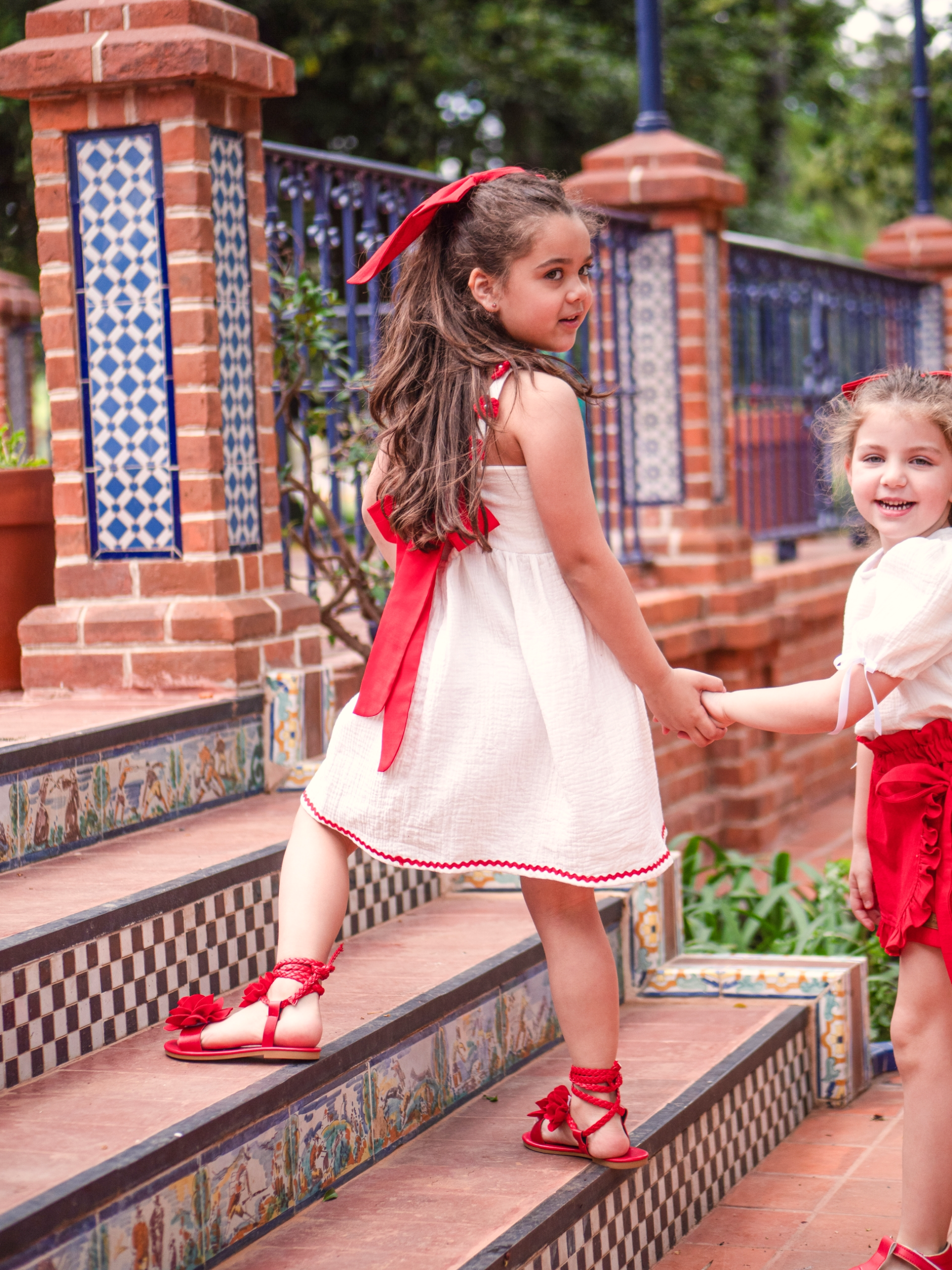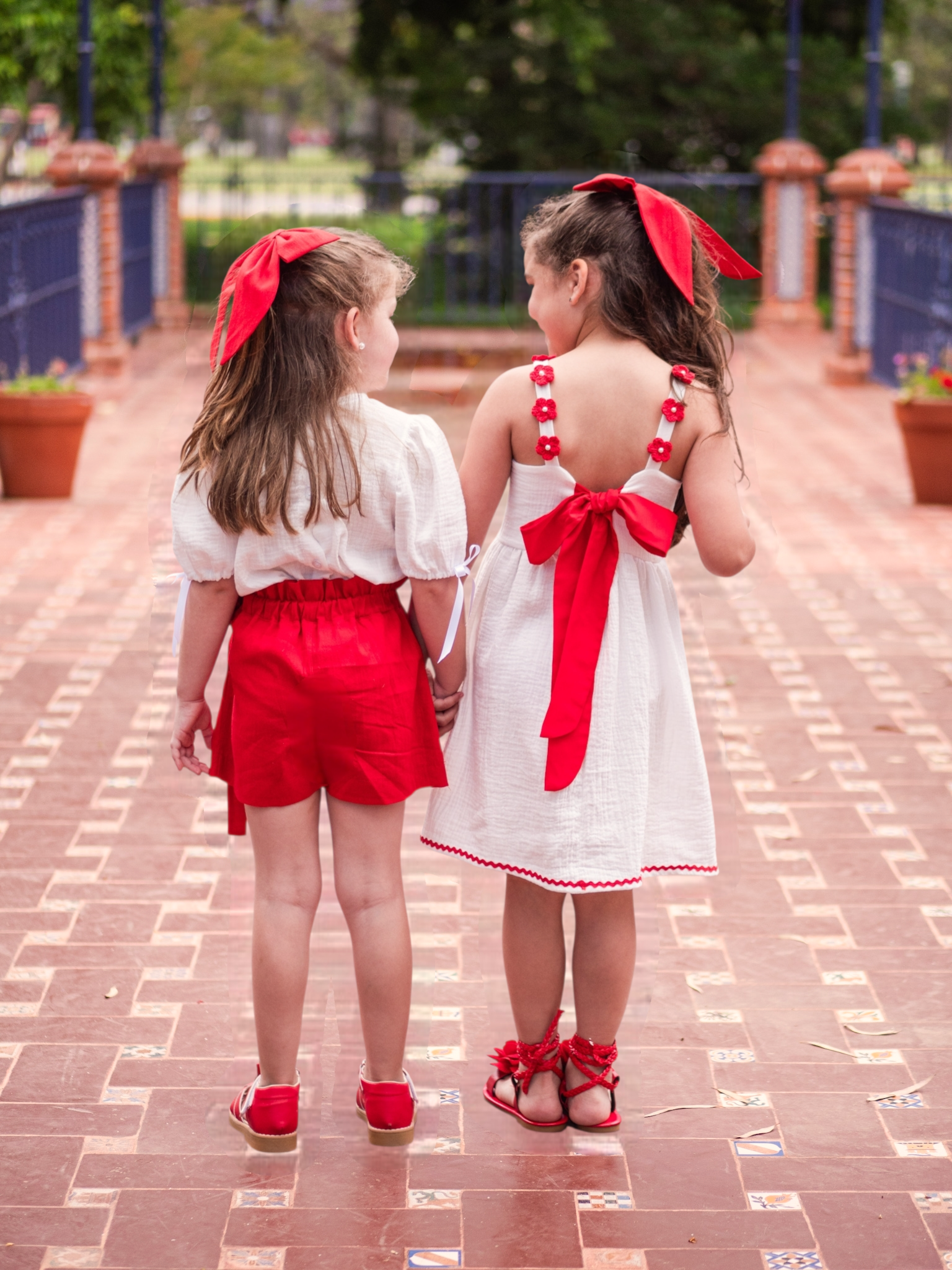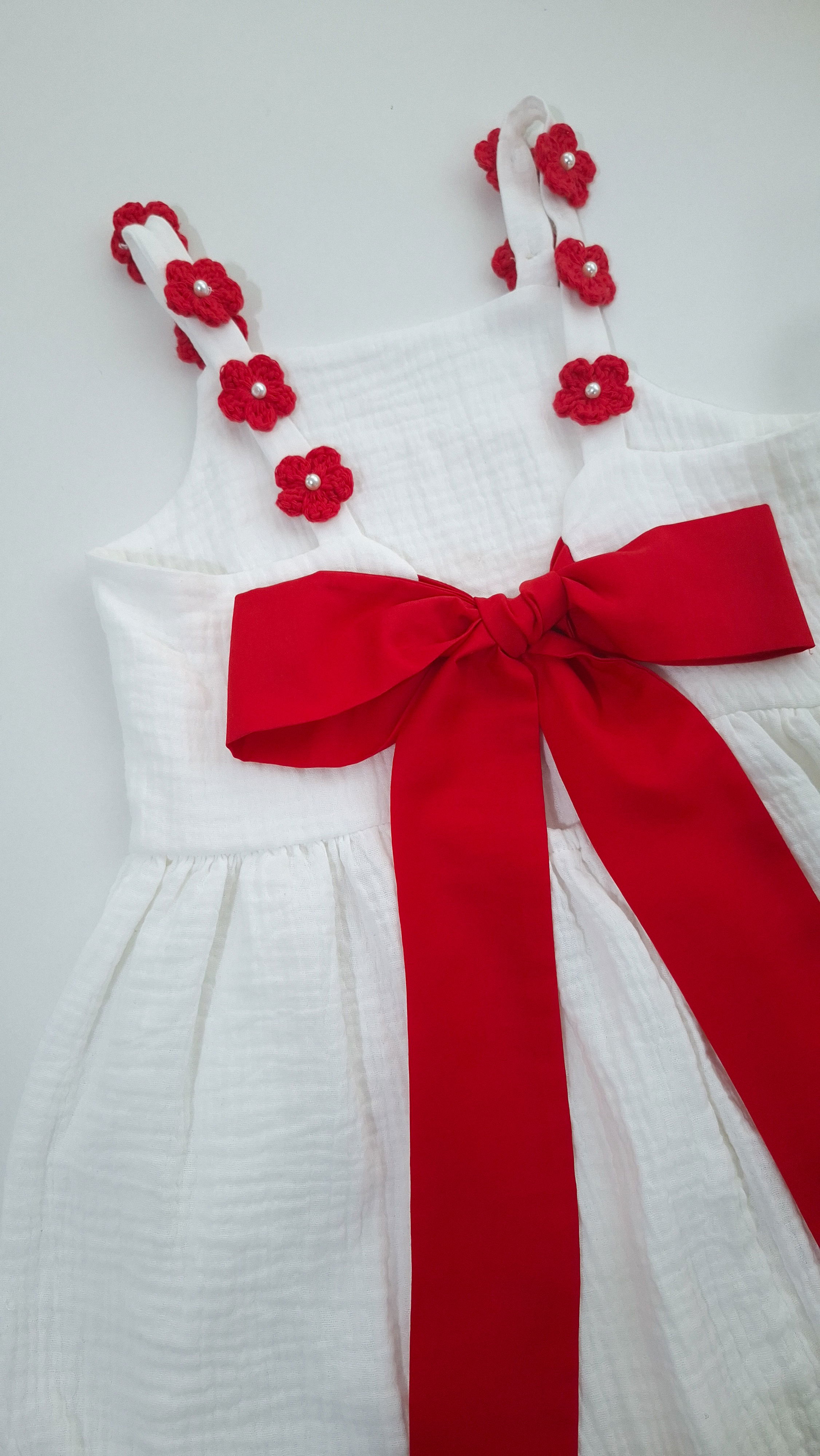 Confeccionado en baby cotton con flores tejidas a crochet y perlas cocidas a mano con galon en zig zag color rojo. Se ajusta en la espalda con lazos rojos y tiene elastico
