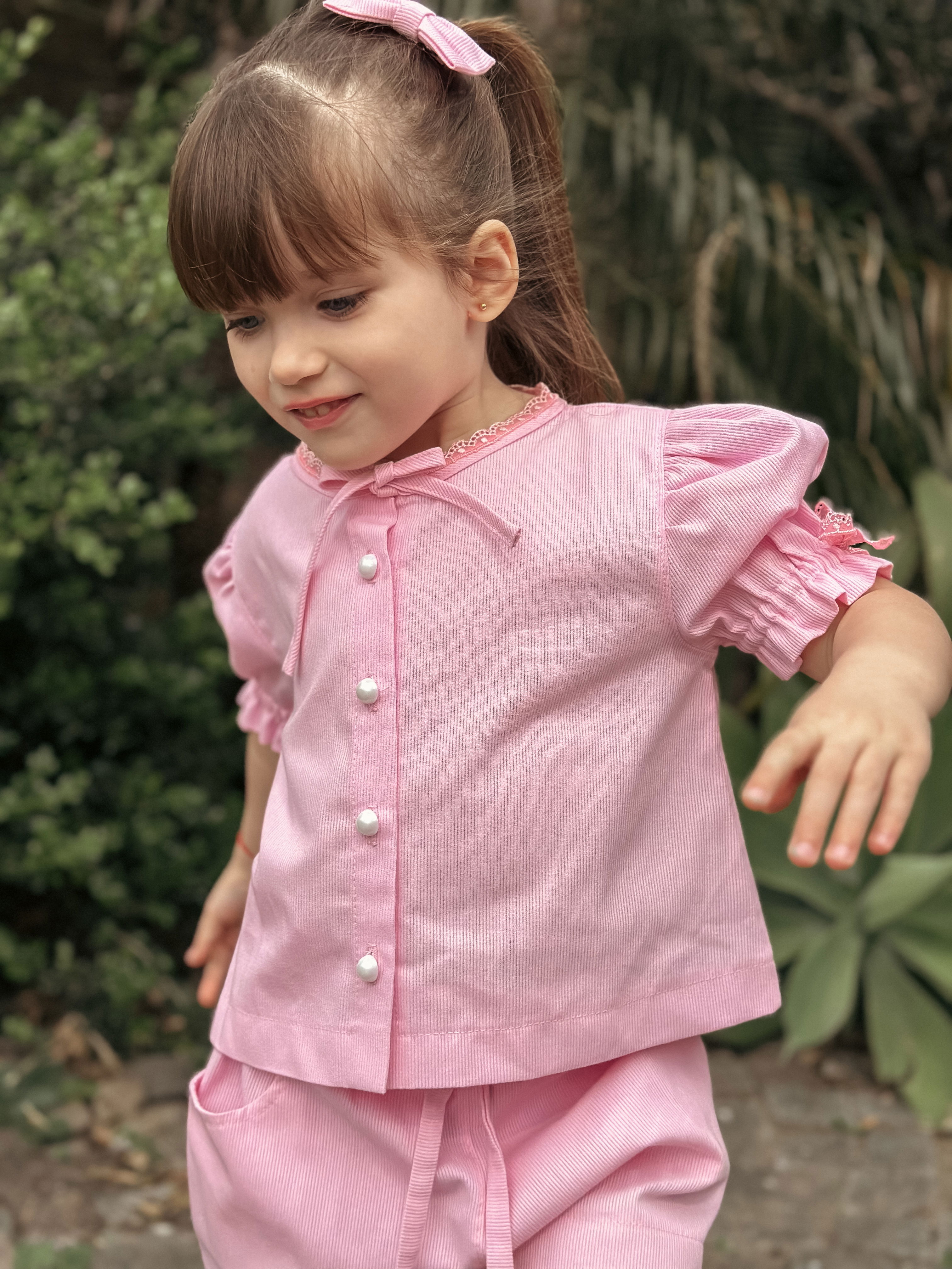 Una prenda que debe tener tu pequeña esta temporada 💕 Al igual que el short Lolita está confeccionada en piqué de algodón, una camisa corte A bastante amplia. Sus detalles de guipure en color rosa en el cuello y mangas lo son todo!!